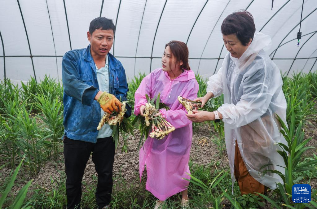 6月19日,吴霞(中)在新丰镇的生姜种植基地查看生姜长势。