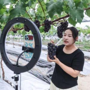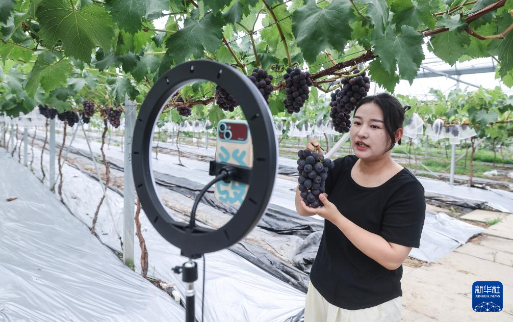 6月19日,邓美琳在葡萄大棚里直播销售葡萄。