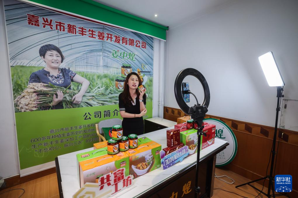 6月19日,吴霞在直播间直播销售新丰嫩姜产品。“90后”吴霞是南湖区新丰镇人,大学毕业后返乡创业。为了让家乡地方特色产品走出去,线下她带领销售部门在江浙沪商超门店上架销售产品;线上她在多个平台开设店铺,年销售额达到1200万元,带动周边群众共富。