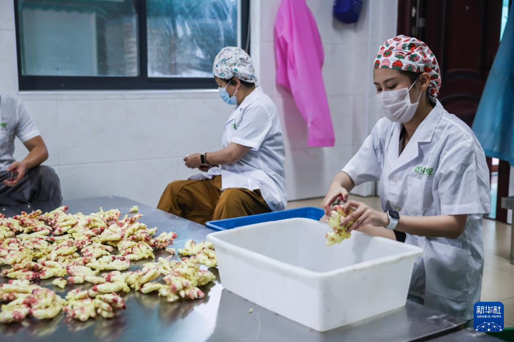 6月19日,吴霞(右)在加工车间内与工人一起分拣生姜。