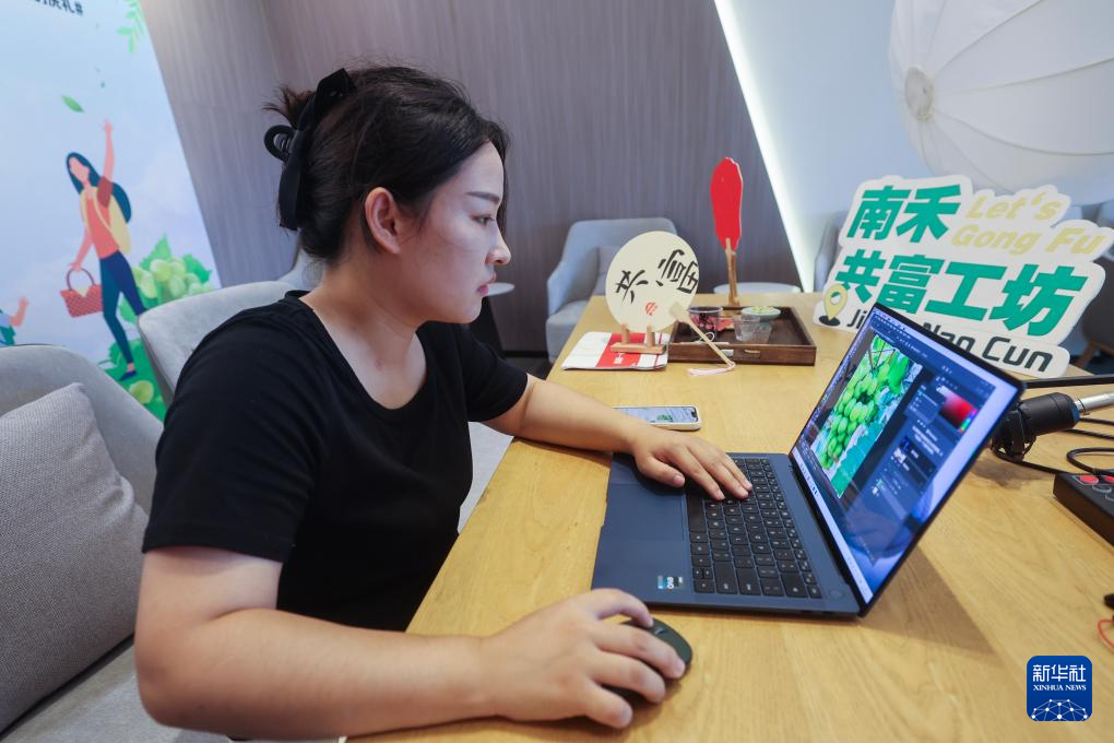 6月19日,邓美琳在南禾共富工坊直播间里设计葡萄创意图片,准备用于新媒体引流。