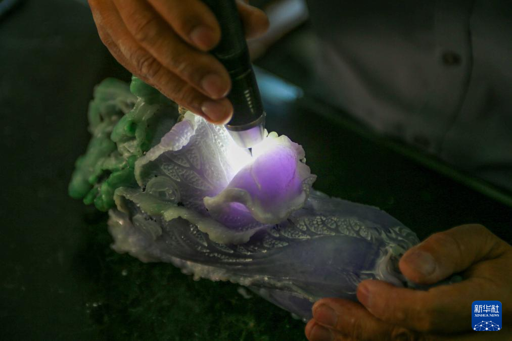技师们在张铁成工作室内雕刻玉石(6月15日摄)。