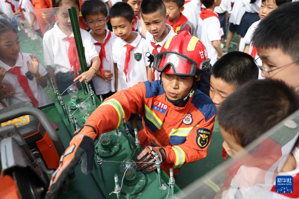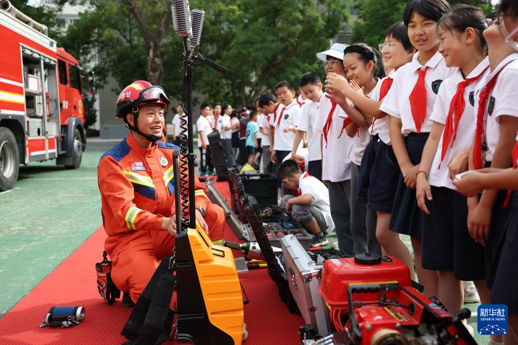 6月19日,兰州市消防救援支队指战员在兰州市东郊学校为学生介绍消防器材装备。