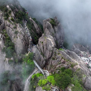 5月20日,游客在位于安徽省黄山市的黄山风景区天都峰游玩(无人机照片)。
