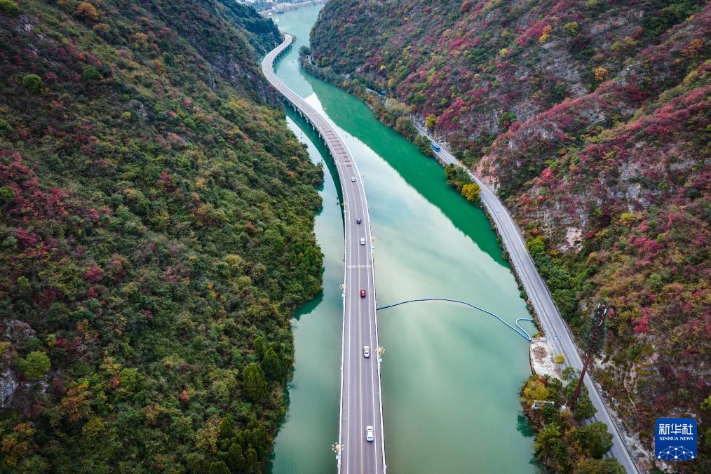 2023年12月2日,汽车行驶在宜昌市兴山县水上公路上(无人机照片)。