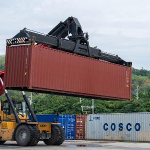 6月20日,在株洲中车物流园,工作人员在进行集装箱装车作业。