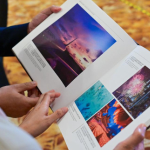 6月19日,在马来西亚首都吉隆坡举行的中马建交50周年图片展上,来宾在观看相关主题照片编纂成的画册。