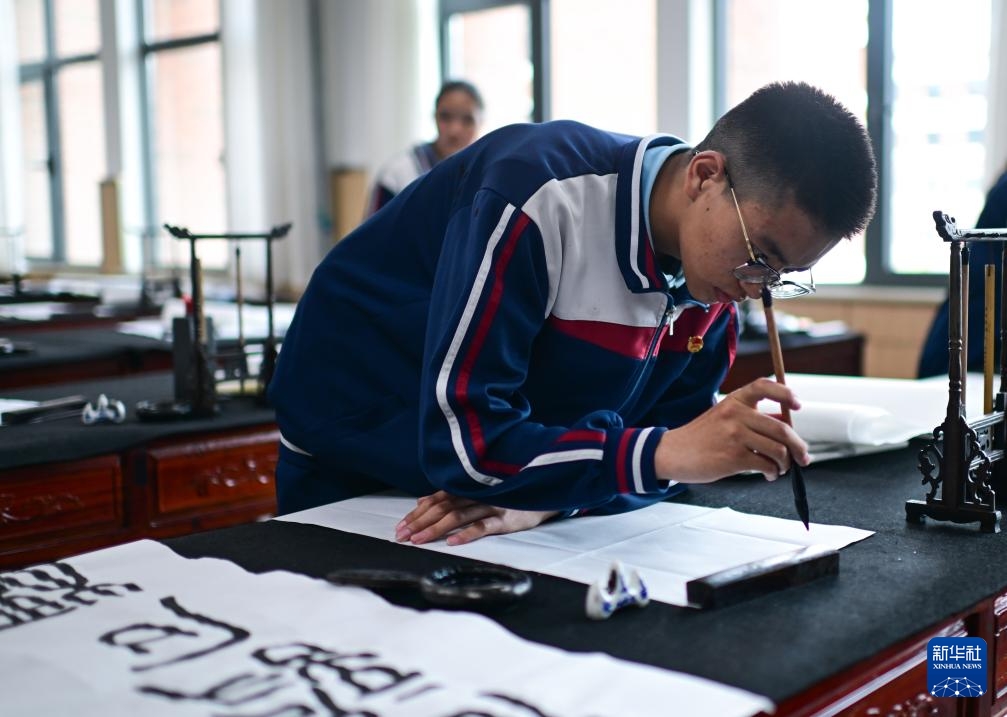6月18日,上海援青教师阚延俊在给学生上音乐课。