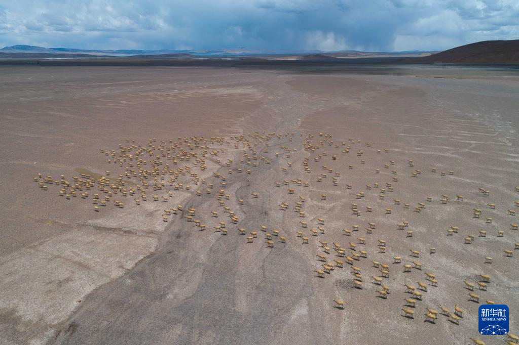 大群迁徙的藏羚羊在羌塘保护区核心区向产羔地迁徙(6月13日摄,无人机照片)。