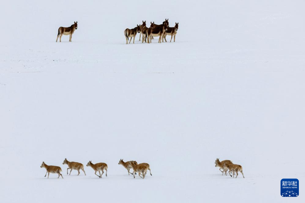 一群藏野驴在雪地中注视着迁徙的藏羚羊(5月8日摄)。