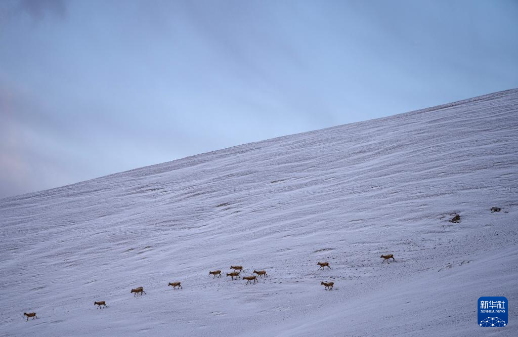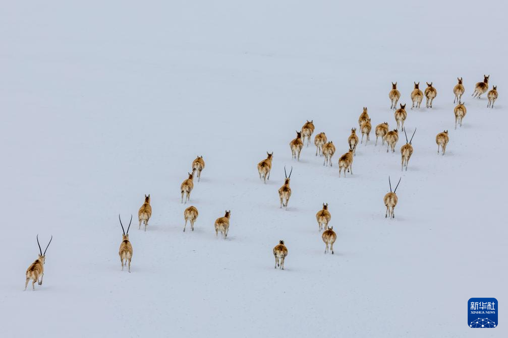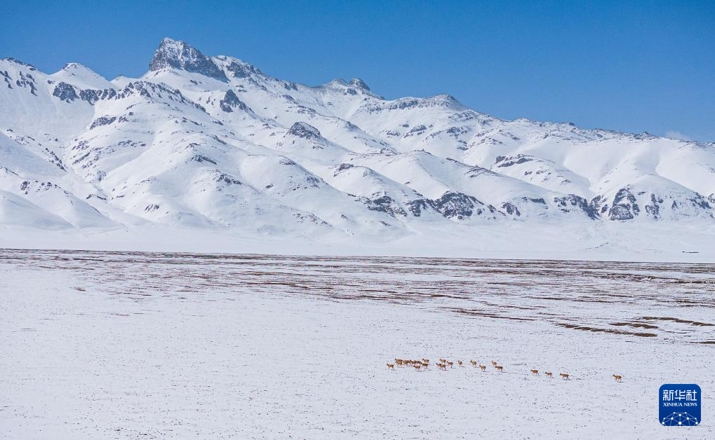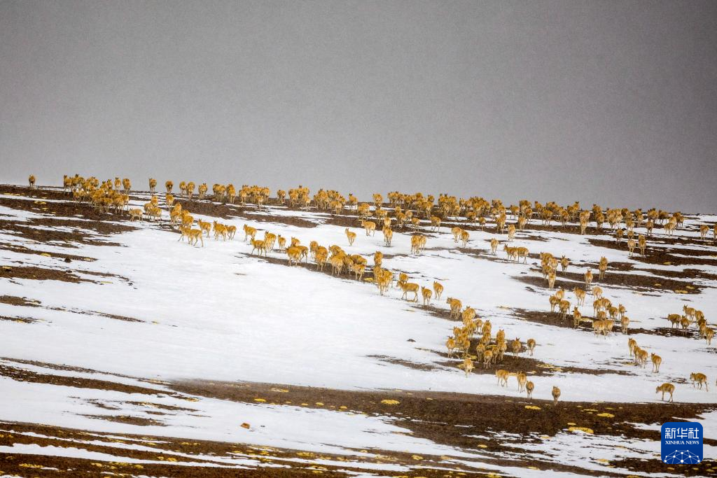 这是雪地中迁徙的藏羚羊(5月8日摄)。