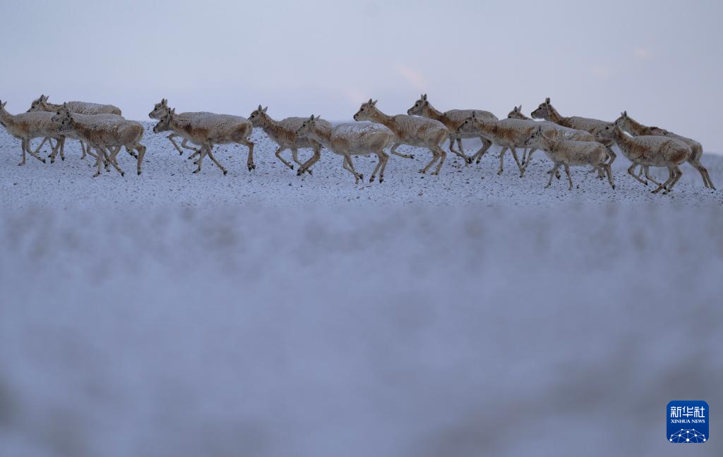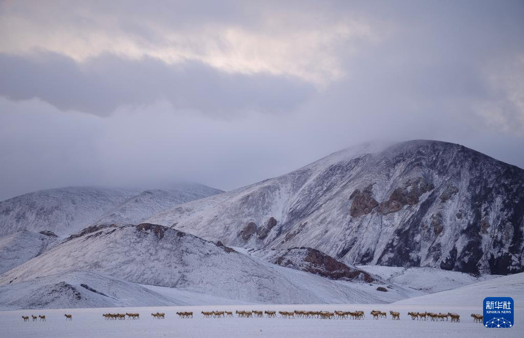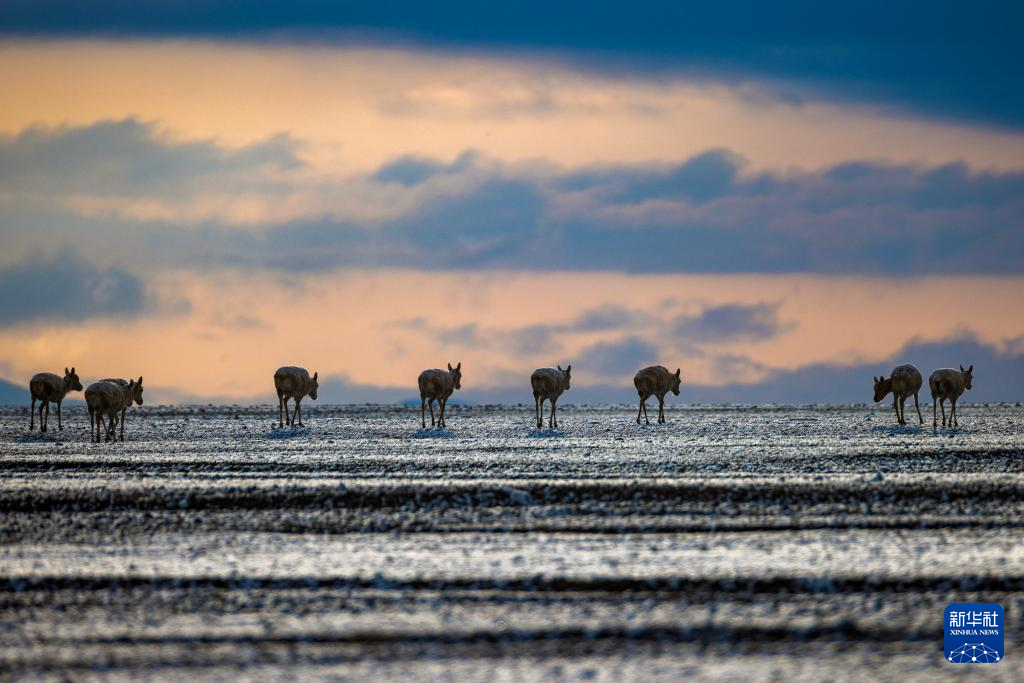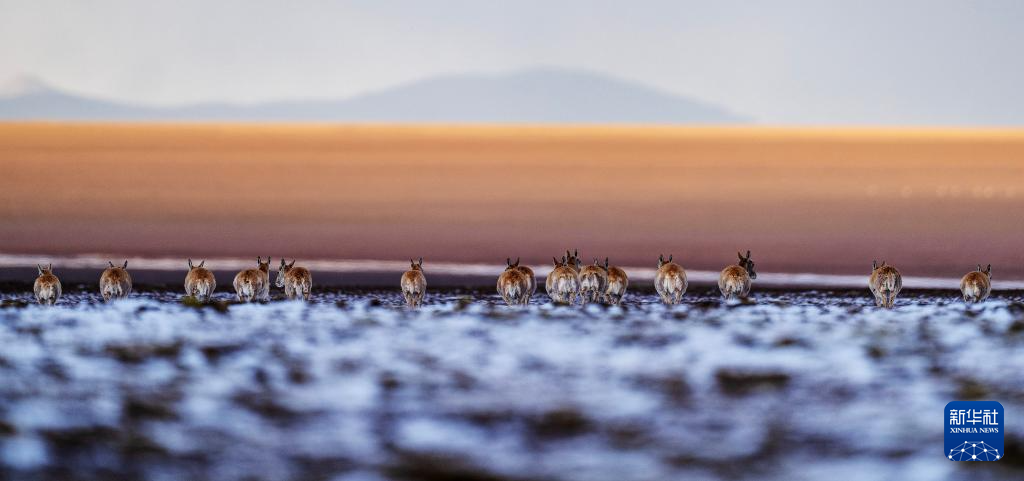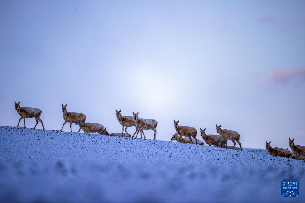 6月15日清晨雪后,在羌塘国家级自然保护区,迎着朝霞前行在迁徙路上的一群藏羚羊。