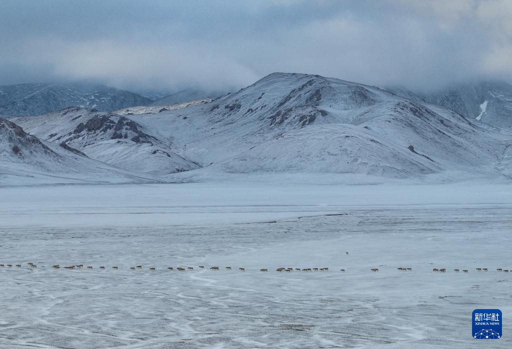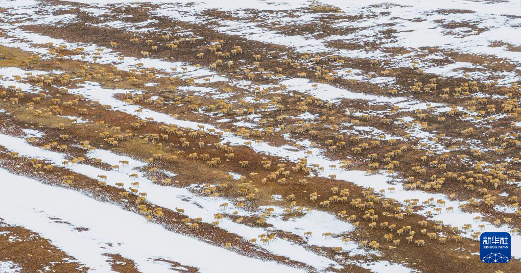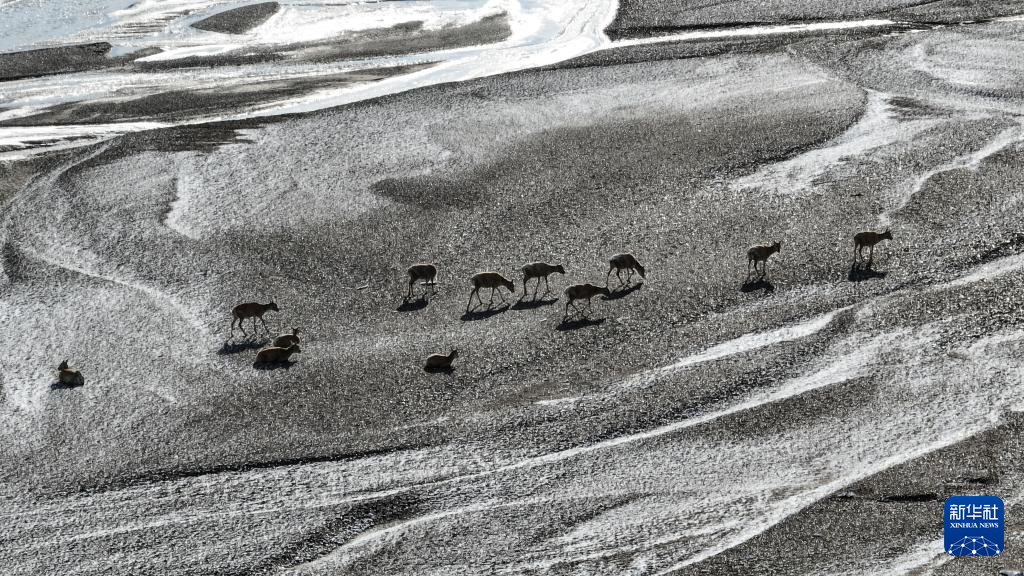 在甜水河畔荒滩雪地中向产羔地迁徙的藏羚羊(6月14日摄,无人机照片)。