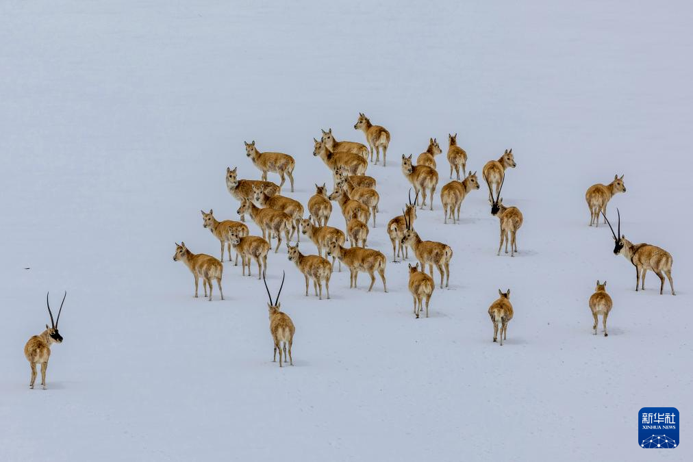 几只公藏羚羊守护母藏羚羊迁徙之路(5月8日摄)。