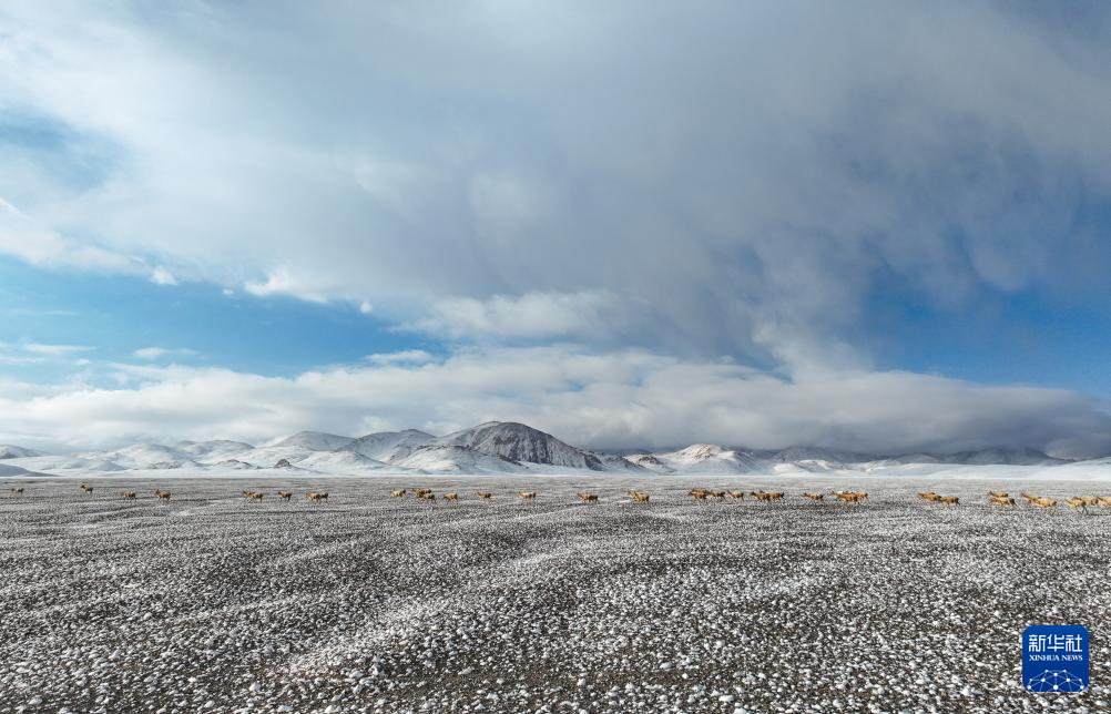 在甜水河畔荒滩雪地中向产羔地迁徙的藏羚羊(6月15日摄,无人机照片)。