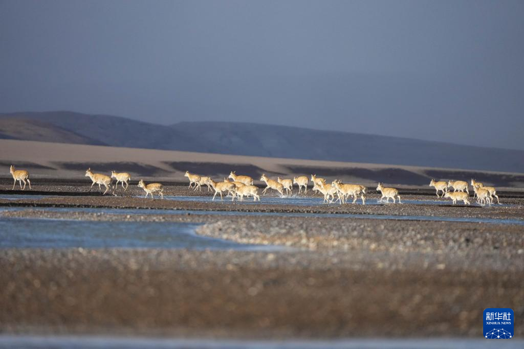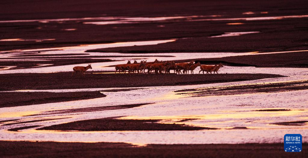 6月13日傍晚,在羌塘国家级自然保护区,迁徙中的母藏羚羊越过甜水河。