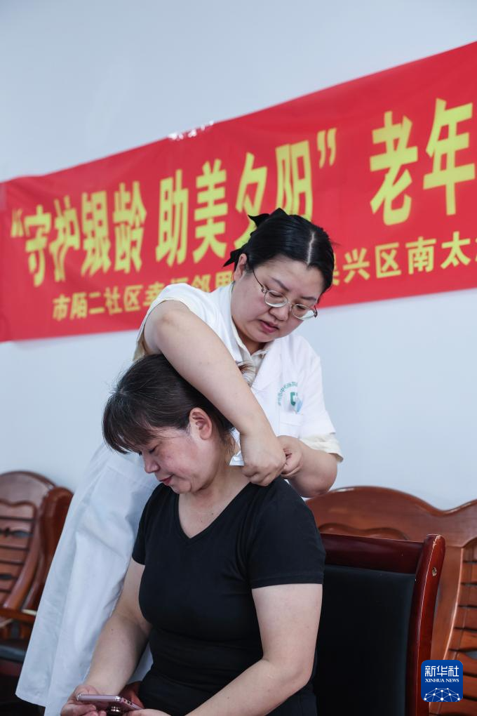 6月20日,在龙泉街道市陌二社区,卫生院医生在给居民开展中医冬病夏治“穴位贴敷”。