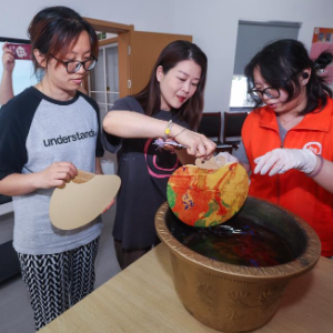 6月20日,在龙泉街道市陌二社区,居民们在志愿者带领下制作传统“漆扇”。