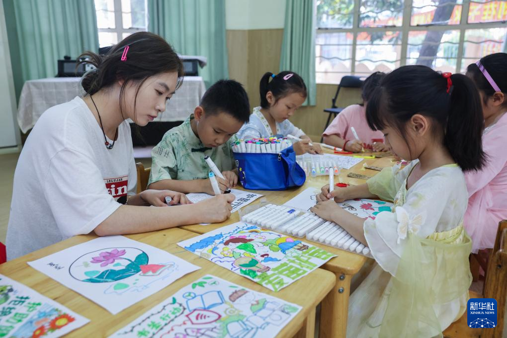 6月20日,在龙泉街道天使幼儿园,老师带着孩子们绘制夏至传统图画、制作夏季护苗绿书签。
