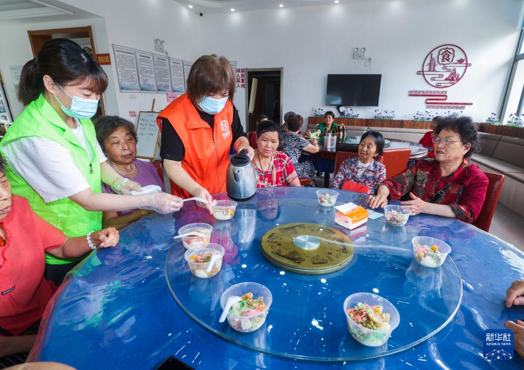 6月20日,在龙泉街道老年食堂内,志愿者在给老人们准备当地特色的消暑食物“多样汤”。“多样汤”是湖州夏季传统美食,由蜜枣、金桔、红丝绿丝、冬瓜糖、薄荷水等制作而成。