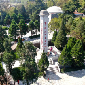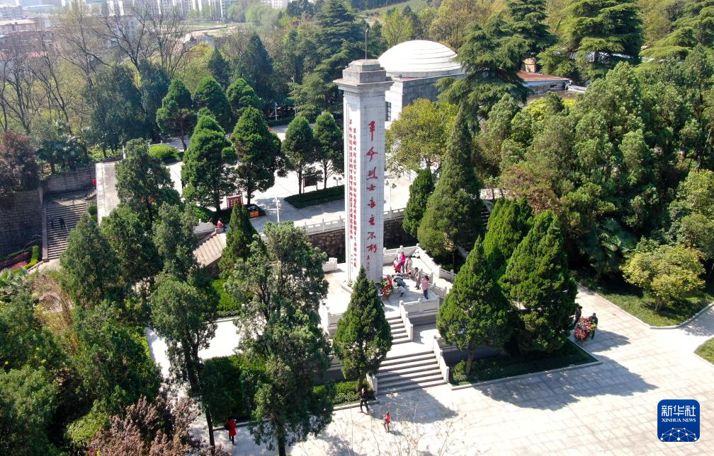 人们在鄂豫皖苏区首府烈士陵园革命烈士纪念碑前祭奠。河南省新县地处大别山腹地,是鄂豫皖苏区首府所在地,这里先后诞生了红四方面军、红二十五军、红二十八军等多支红军主力(2021年4月4日摄 无人机照片)。