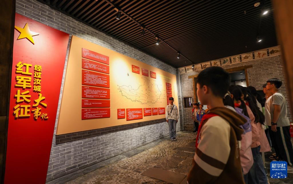 2024年5月21日,学生们在湖南省郴州市沙洲村“半条被子的温暖”专题陈列馆中参观。