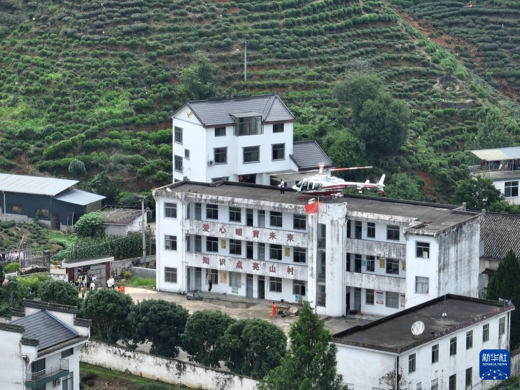 6月21日,救援直升机准备停靠黄山市歙县绍濂乡小溪中心小学运送物资。