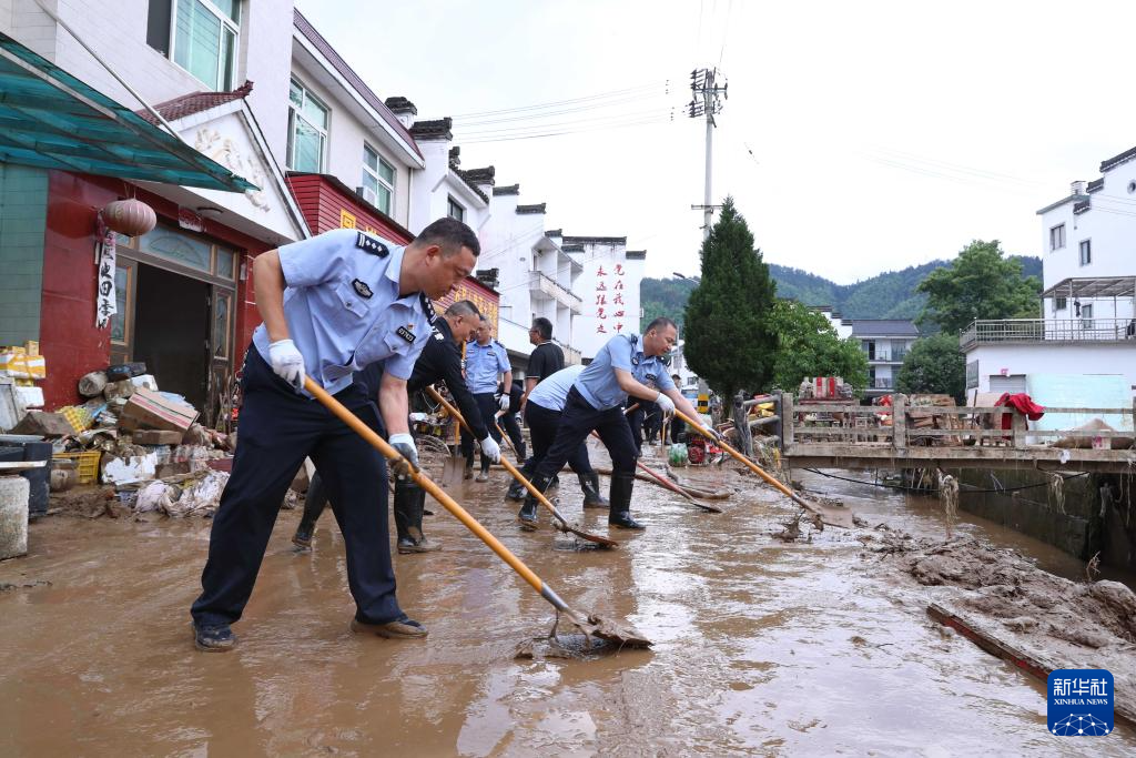 6月21日,在黄山市歙县绍濂乡绍濂村,歙县公安局民警在清扫过水路面。