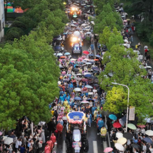 6月21日,华中农业大学学生在校园里冒雨巡游。