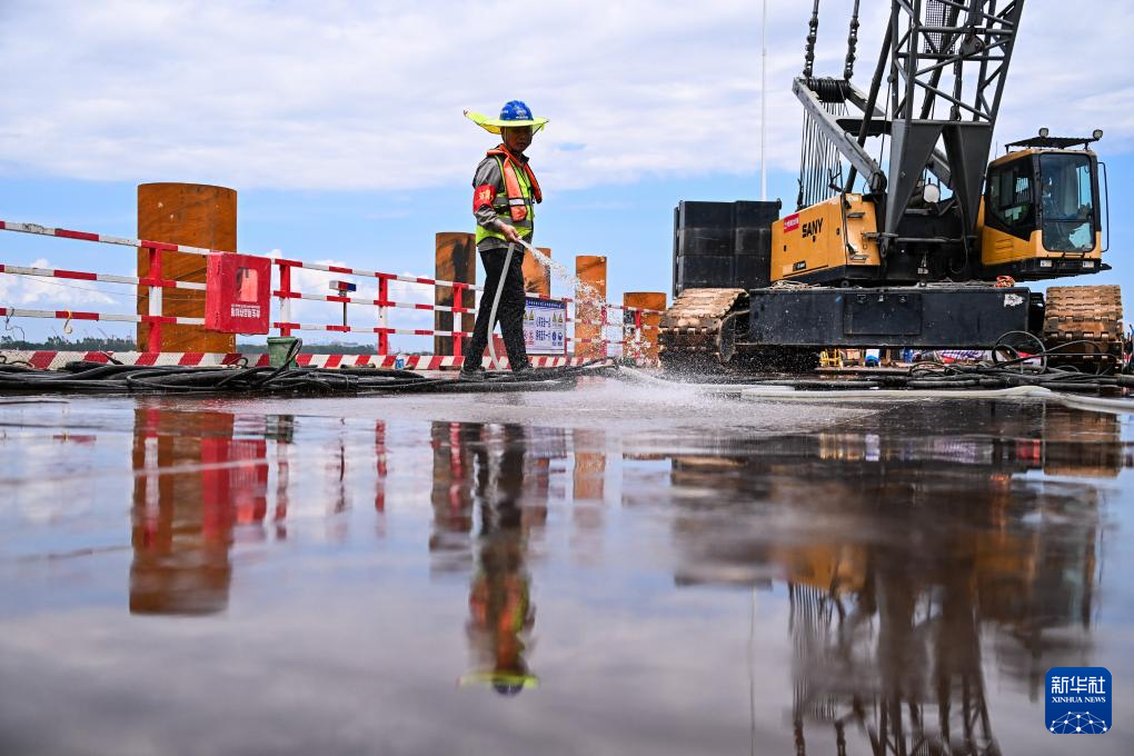 6月21日,中铁建大桥局施工人员为万龙大桥主墩桩基作业平台浇水降温。