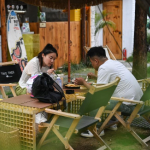 6月20日,游客在栗峪口村土锤咖啡馆就餐。这家咖啡馆由一家废弃粉石厂改造而成,员工基本来自村民。