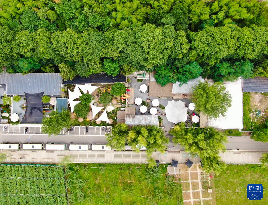 栗峪口村土锤咖啡馆由一家废弃粉石厂改造而成,员工基本来自村民(6月20日摄,无人机照片)。