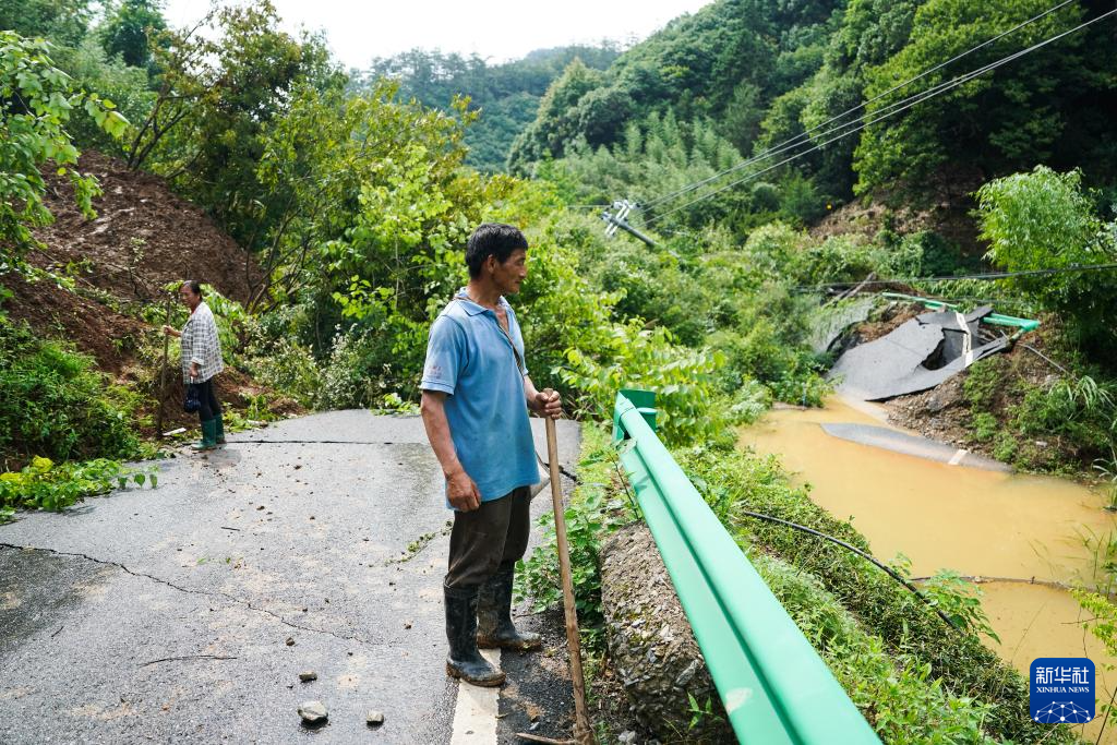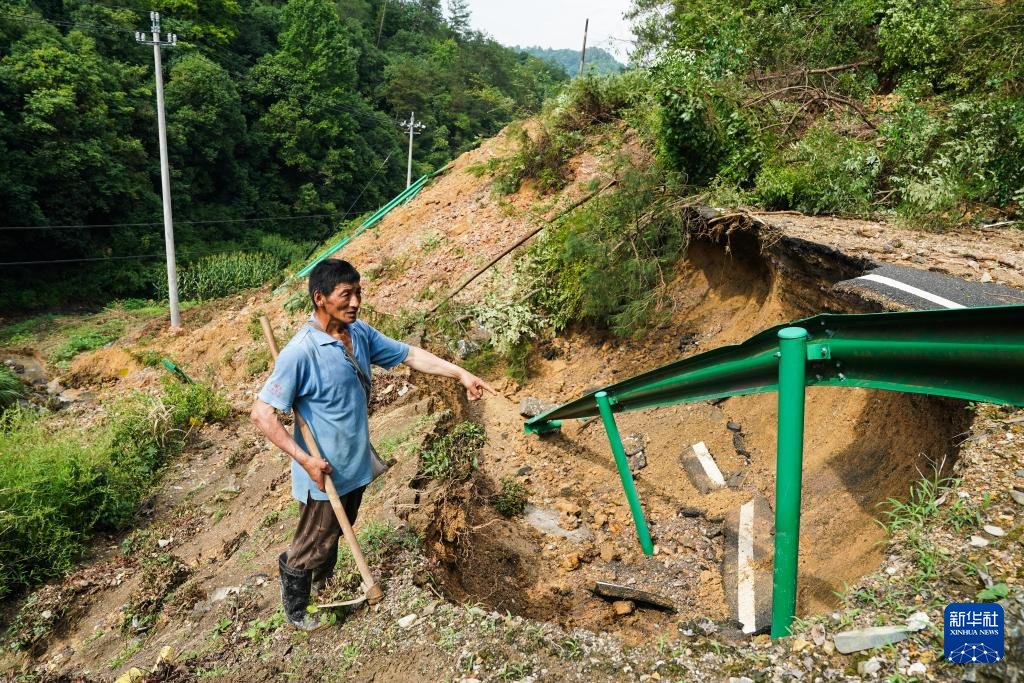 6月21日,在歙县桂林镇008县道一处塌方点,当地村民陈海生(右)查看损毁路段。