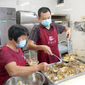6月21日,在平远县仁居镇安置点,厨师谢师傅在为大家分餐。