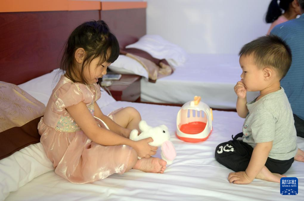 6月21日,在平远县仁居镇安置点,姐弟俩在房间里玩耍。