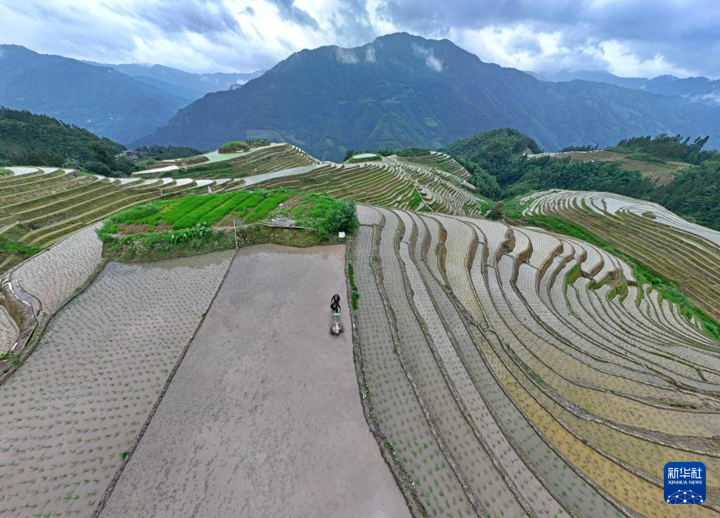 6月22日,村民在广西龙胜各族自治县龙脊梯田耕地(无人机照片)。