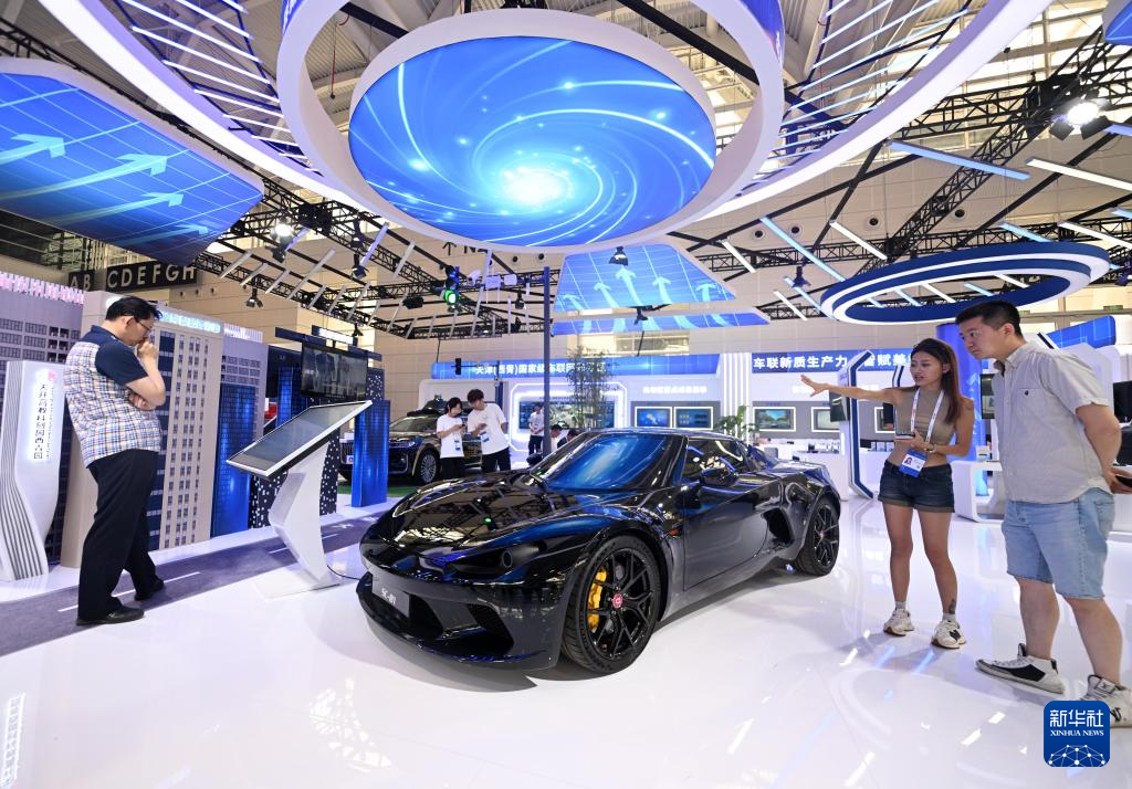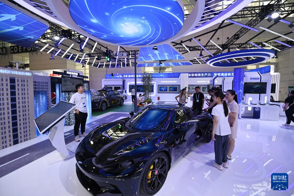 参观者在博览会智能网联汽车展区参观一台新能源跑车(6月22日摄)。