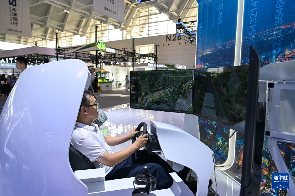 参观者在博览会现场体验天津大学设计研发的一款可进行多场景智能网联车测试的仿真模拟器(6月20日摄)。