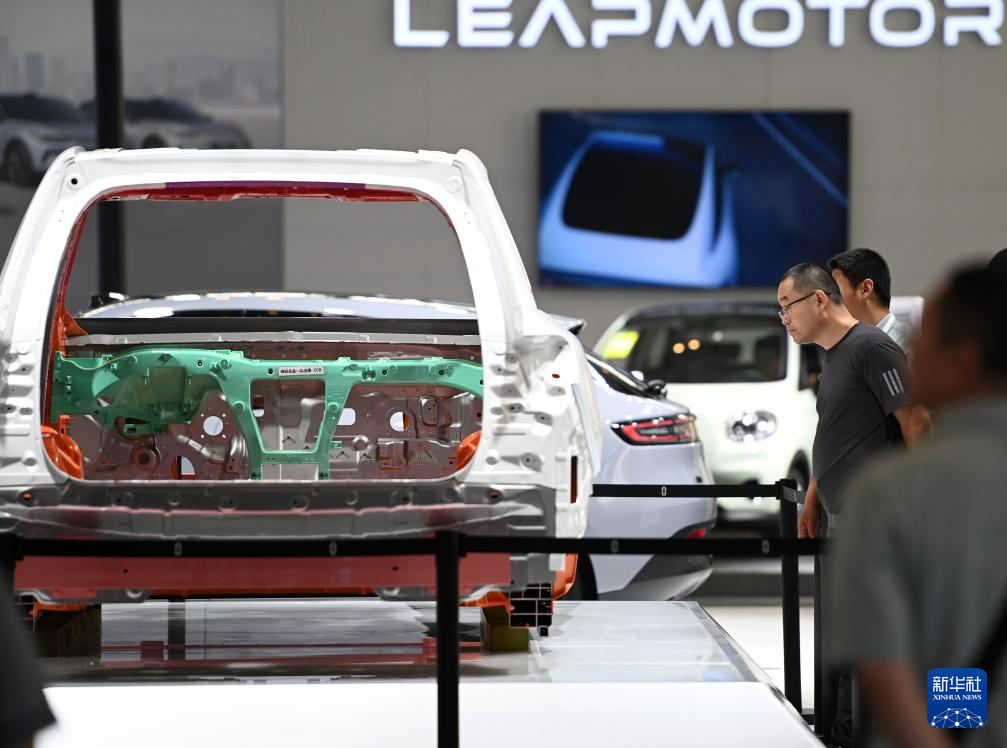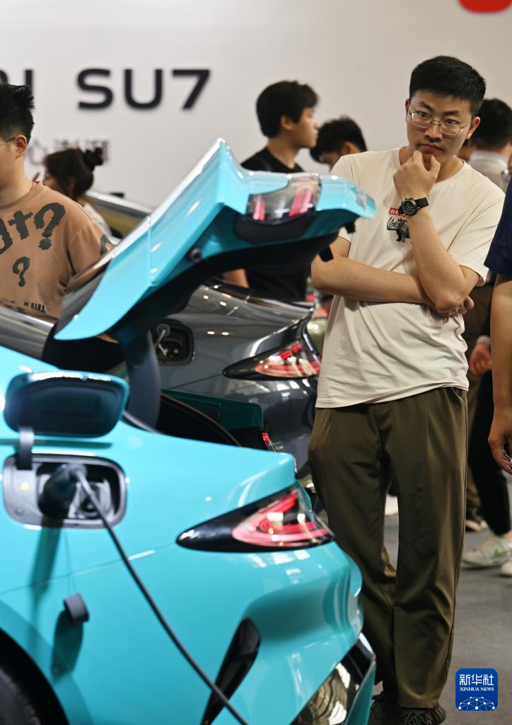 观众在博览会上的小米汽车展台参观(6月22日摄)。