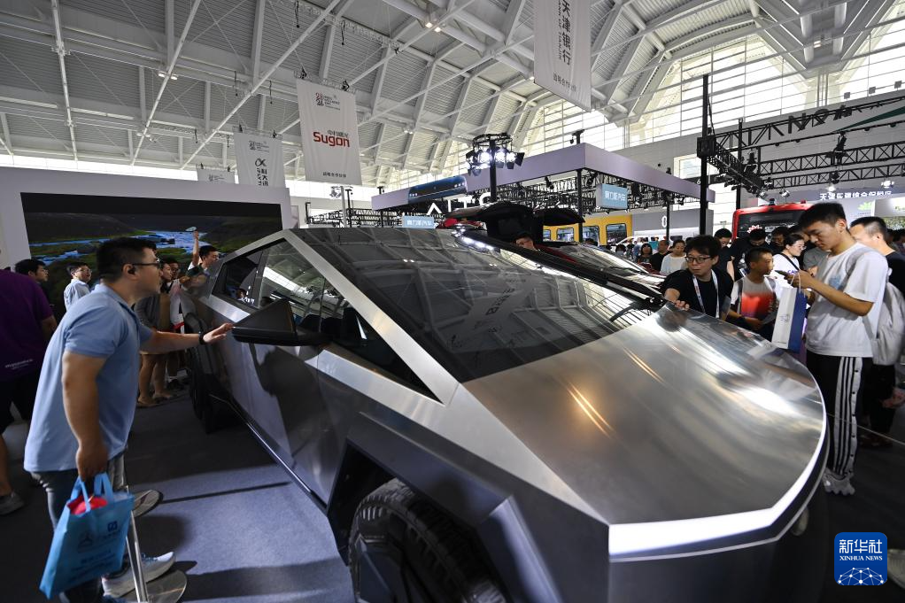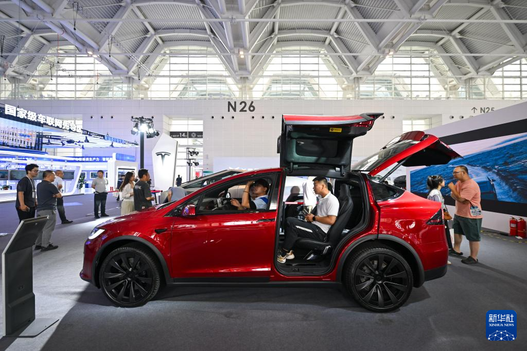 观众在博览会上的特斯拉展台参观(6月22日摄)。