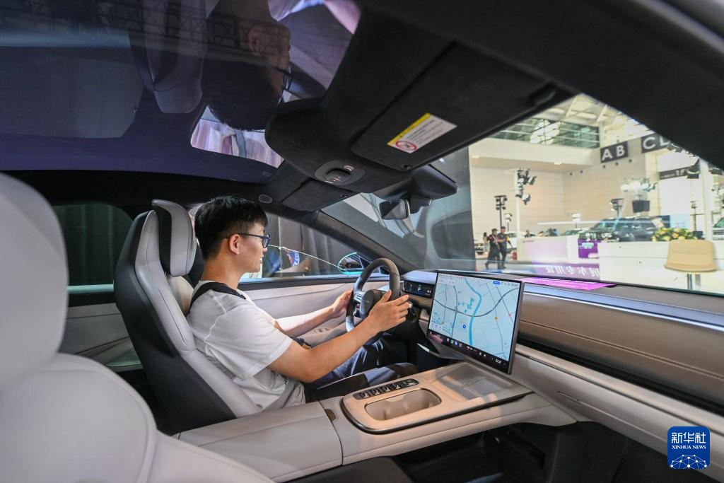 观众在博览会现场静态体验一款智能网联电动汽车(6月22日摄)。