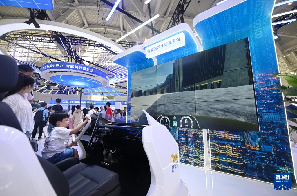 一名儿童在博览会智能网联汽车展区体验模拟驾驶(6月22日摄)。