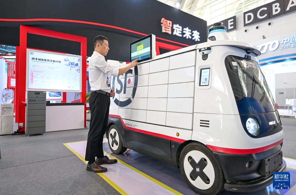 参展商在博览会现场演示操作一款可自动驾驶的无人配送物流车(6月20日摄)。