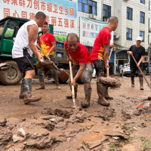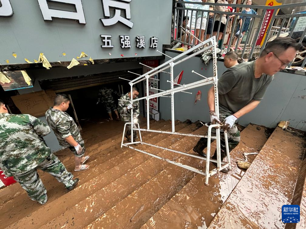 6月23日,沅陵县五强溪镇当地政府组织力量帮助沿街商铺搬运被洪水浸泡的物品(手机照片)。