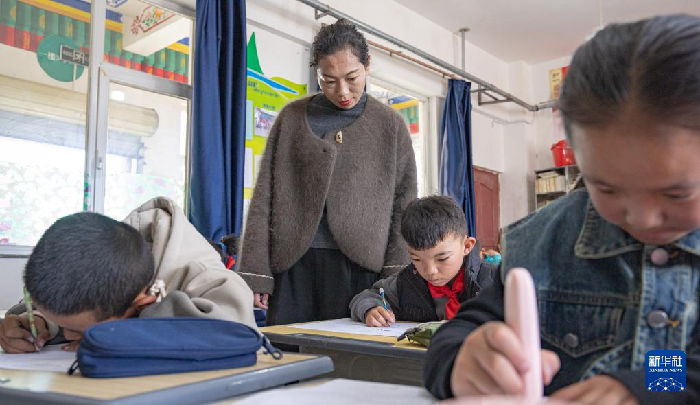 班戈县中石化小学的老师德吉措姆在督促学生完成试卷(6月22日摄)。