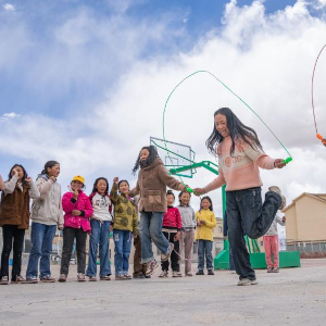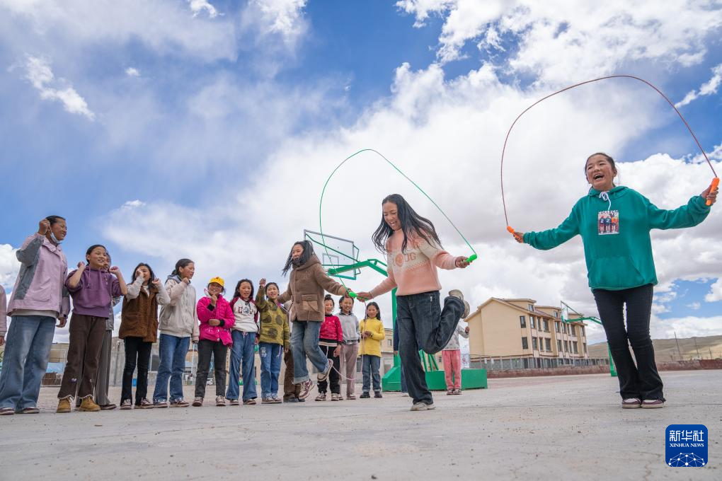 班戈县中石化小学学生尼玛措姆(右二)和同学们在操场上跳绳(6月22日摄)。