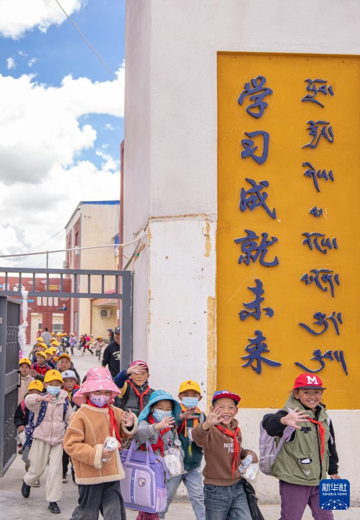 班戈县中石化小学学生放学后走出校门(6月22日摄)。