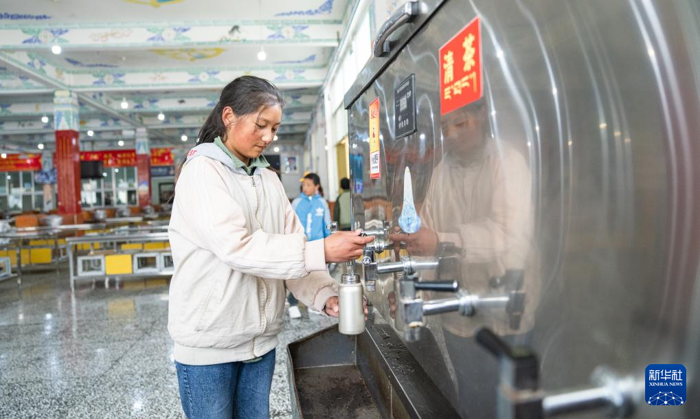 班戈县中石化小学学生旺青拉姆用水杯接清茶(6月22日摄)。