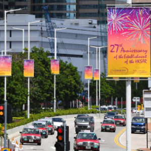 随着香港回归祖国27周年纪念日临近,香港街头悬挂国旗、区旗,张贴庆祝海报,喜庆气氛日渐浓厚。