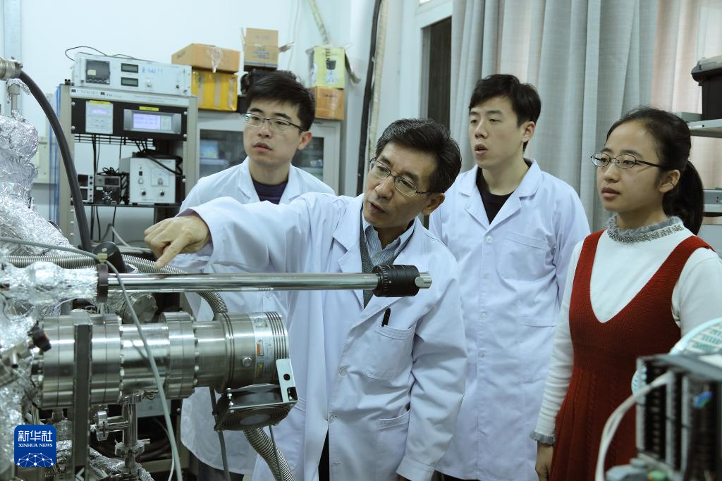 2017年10月17日,薛其坤(前左)与学生在清华大学低维量子物理国家重点实验室讨论实验工作。